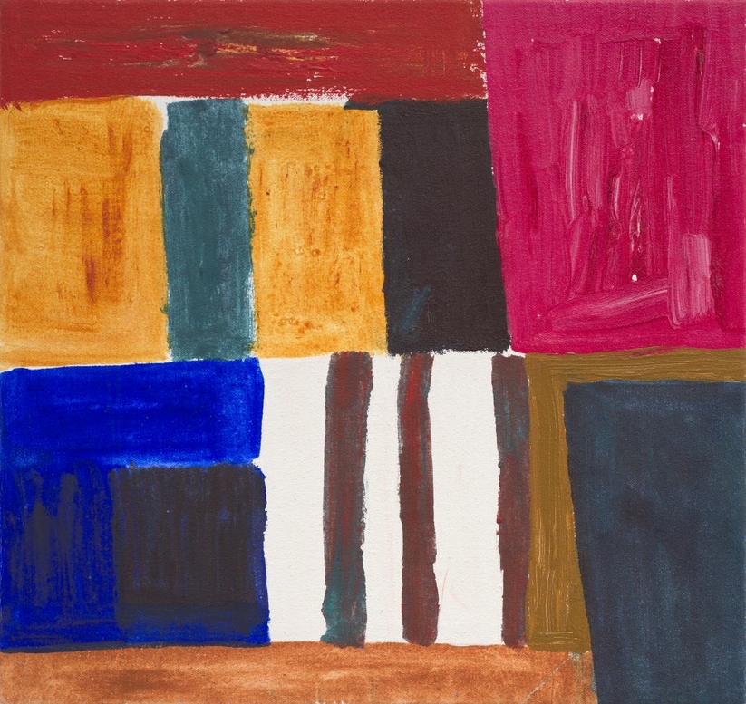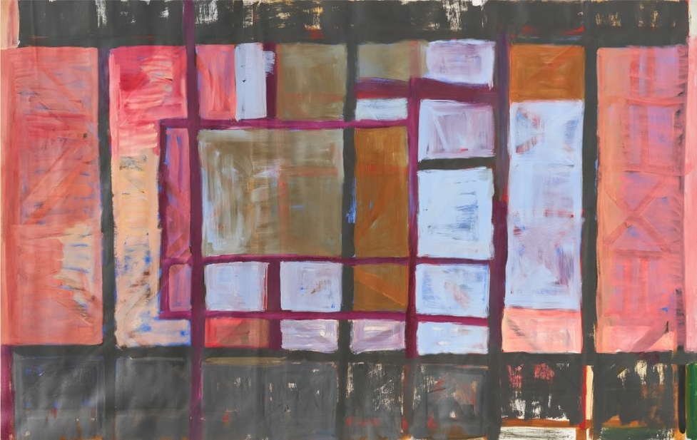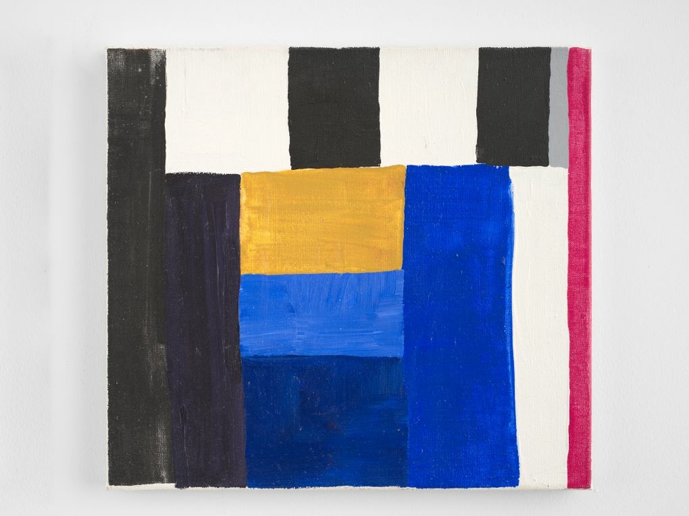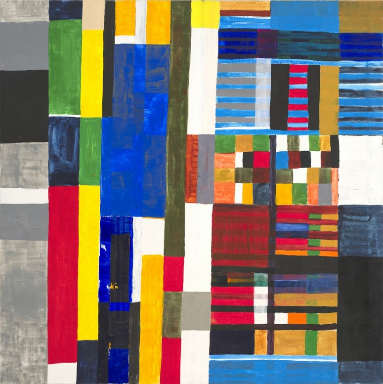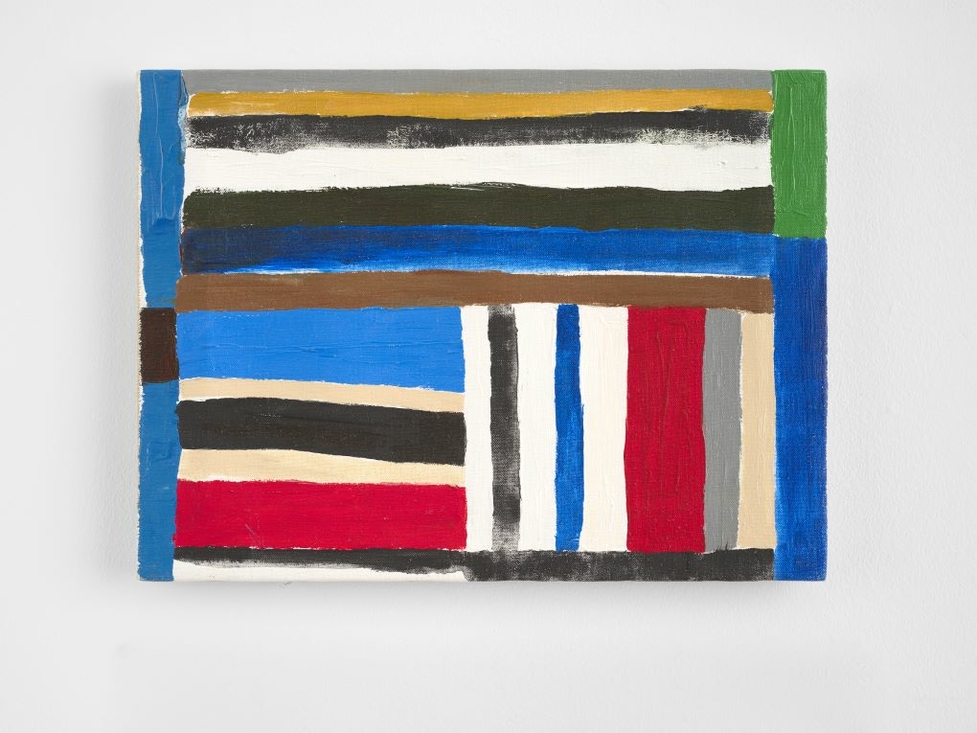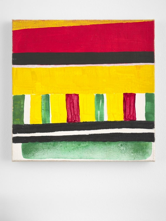 Kwami spent the first fifty years of his life in Africa, a period that shaped his artistic vision in lasting ways. Early influences included the kiosks, hand-painted signage and improvised architecture of West African towns – structures whose forms translated into his paintings in ways that always suggested scale, even in the smallest works. These environments, together with Ewe and Asante textile design, jazz, and the tradition of mural painting, offered him a vocabulary of grids, rhythms and chromatic relationships through which he developed a profoundly original language. Whether in architectural structures or textiles, Kwami found vehicles for exploring the expressive and structural potential of colour: blocks and stripes of uneven sizes converge and diverge in patterns that evoke cadence, syncopation and the paradoxical tensions he sought to hold “in a moment”.