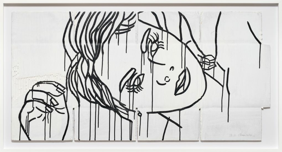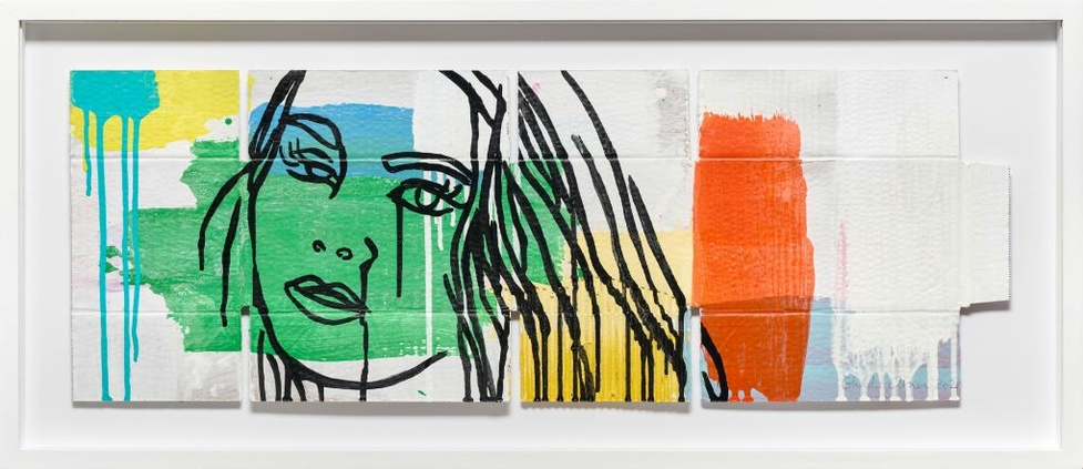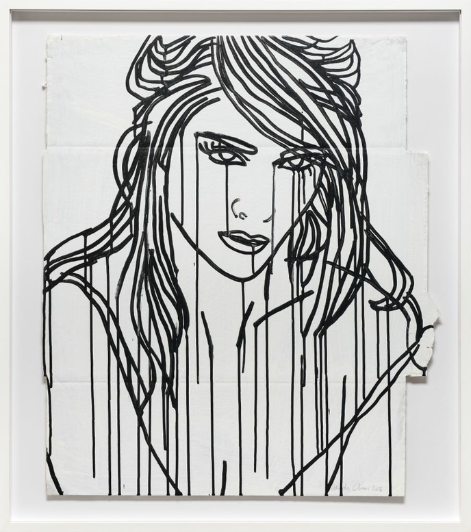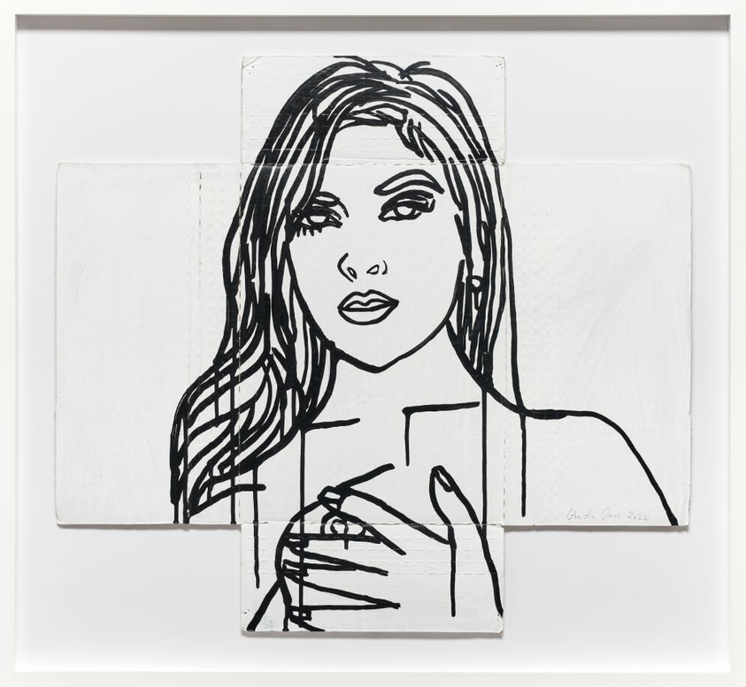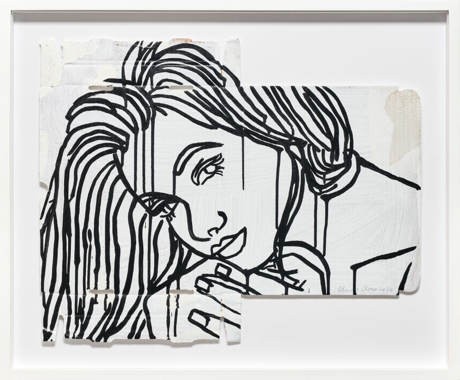 The exhibition begins with a group of recent works on cardboard which introduce a subtle yet noticeable shift in surface and tone. Amer works not on canvas but on unfolded cardboard boxes gathered from the street. Their surface carries the trace of use, showing faint folds, seams and markings beneath the drawing. Across these textured planes, Amer renders female figures in ink with a line that is both bold and firm. The ink moves across the corrugation with easy gravity, settling into the grain and catching lightly in the ridges. The figures hold to the surface with a serene presence, neither posed nor performative. Cardboard is a material of transit, yet here it becomes a place of arrival. Once used to contain and protect, it now offers a ground that holds presence openly. Any echo of the folding screen, once used to hide the female body, is gently reversed. The box has been opened fully and without ceremony. The women remain steady and self-possessed in their own company.