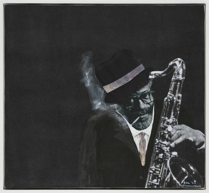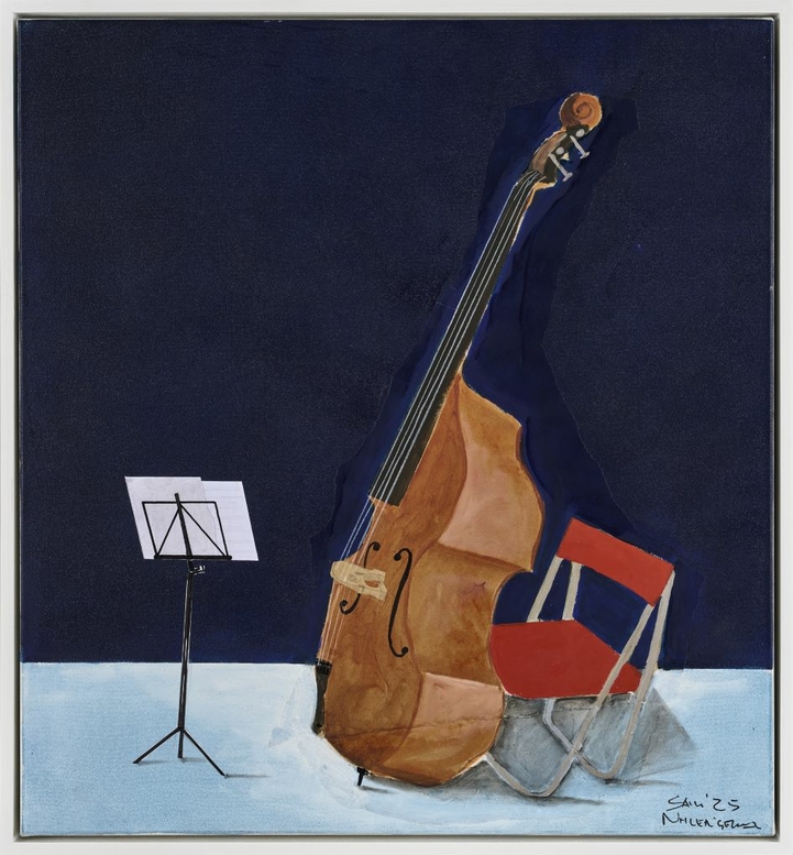 The exhibition centres on a series of ten square works measuring 55 × 55 cm, a format loaded with significance. In 2010, the year Nhlengethwa turned 55, marked the 50th anniversary of Miles Davis’s landmark album Kind of Blue. To honour the occasion, he staged an exhibition of the same name at Goodman Gallery Johannesburg. Ten works produced during that period – a sequence spelling out “All Blues”, the title of Davis’s celebrated composition – were set aside at the time, partly because Nhlengethwa regarded them as a private gift to himself. Fifteen years later, invited to develop a new project for New York, Nhlengethwa has returned to these paintings, revisiting their structures and extending their logic into a fresh series.